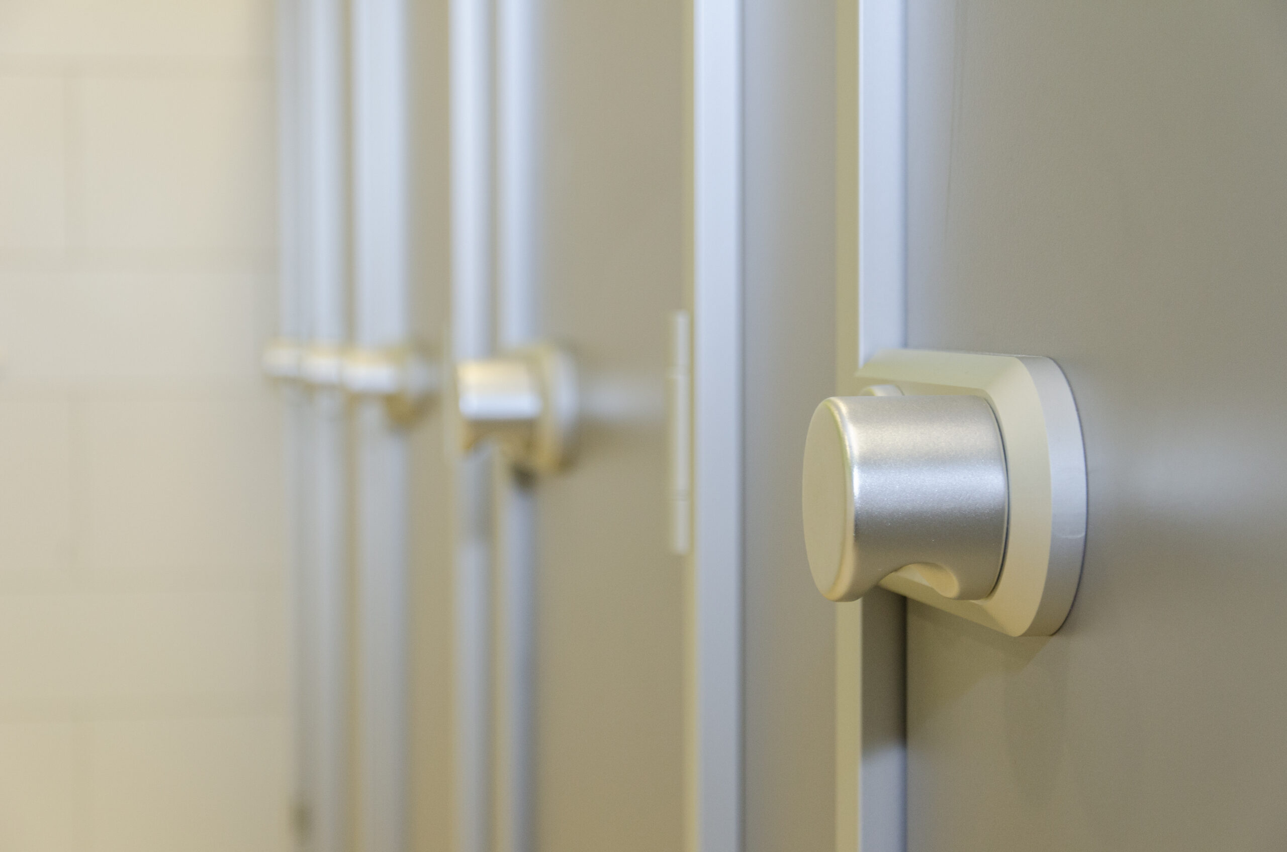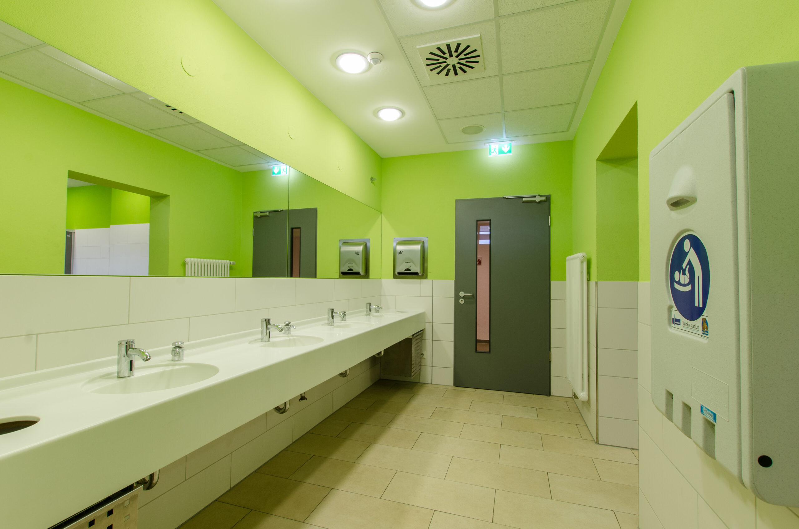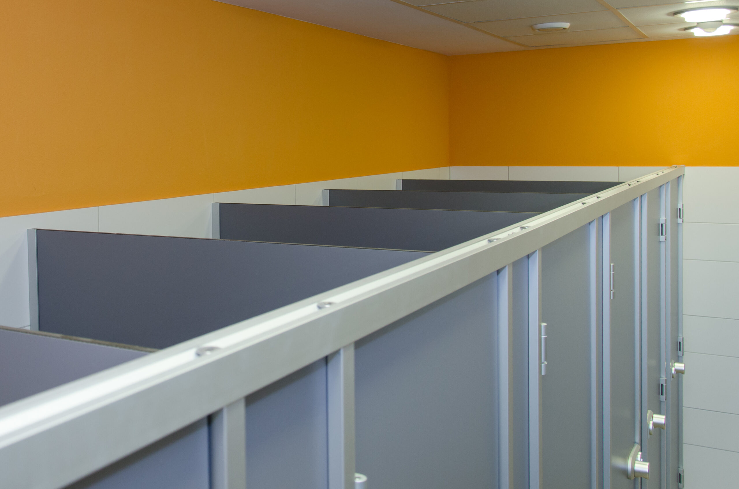 Optisch wurde auf eine klare Linie gesetzt: Wände und Türen sind in zeitlosem Quarzgrau gehalten, während Bänder, Füße und Garnituren aus eloxiertem Aluminium bestehen. So entstand eine Sanitäranlage, die robusten „Heavy-Duty“-Einsatz mit moderner Ästhetik verbindet.