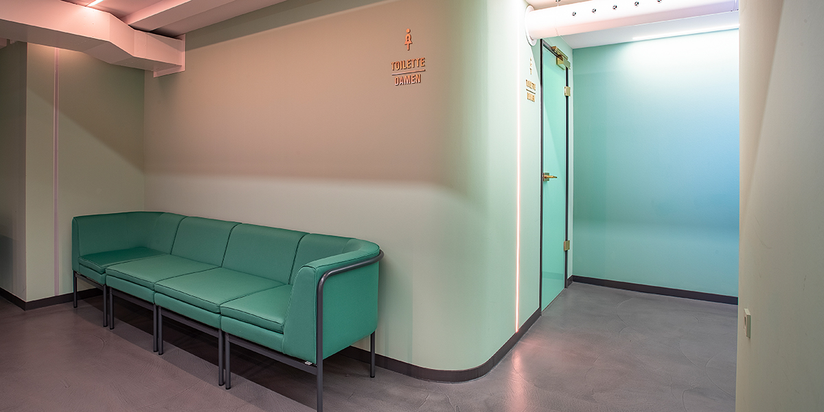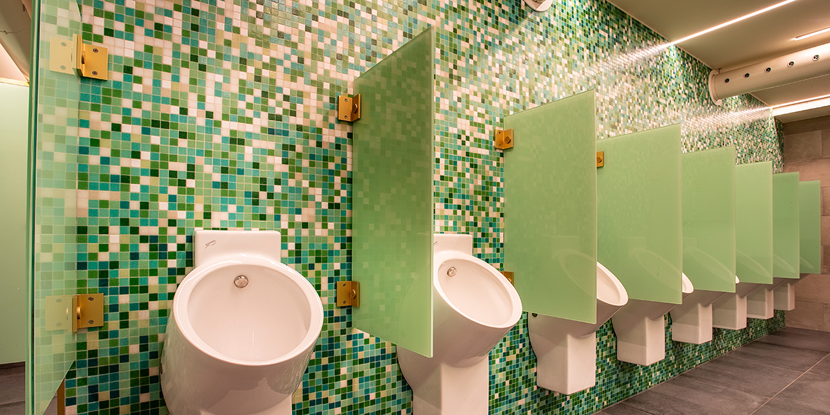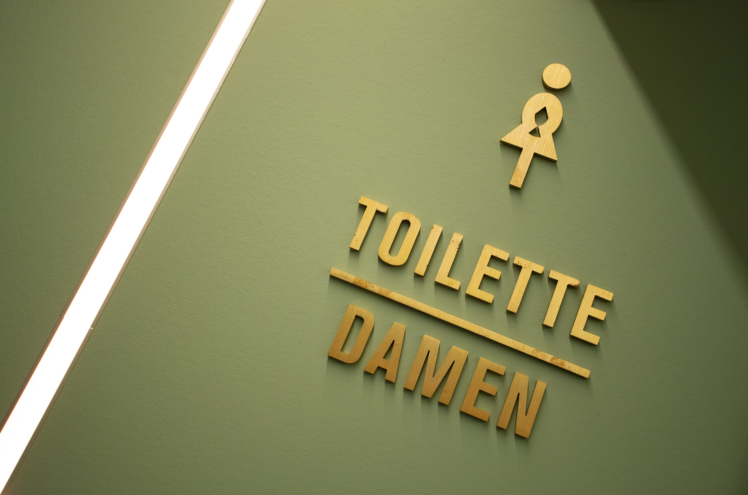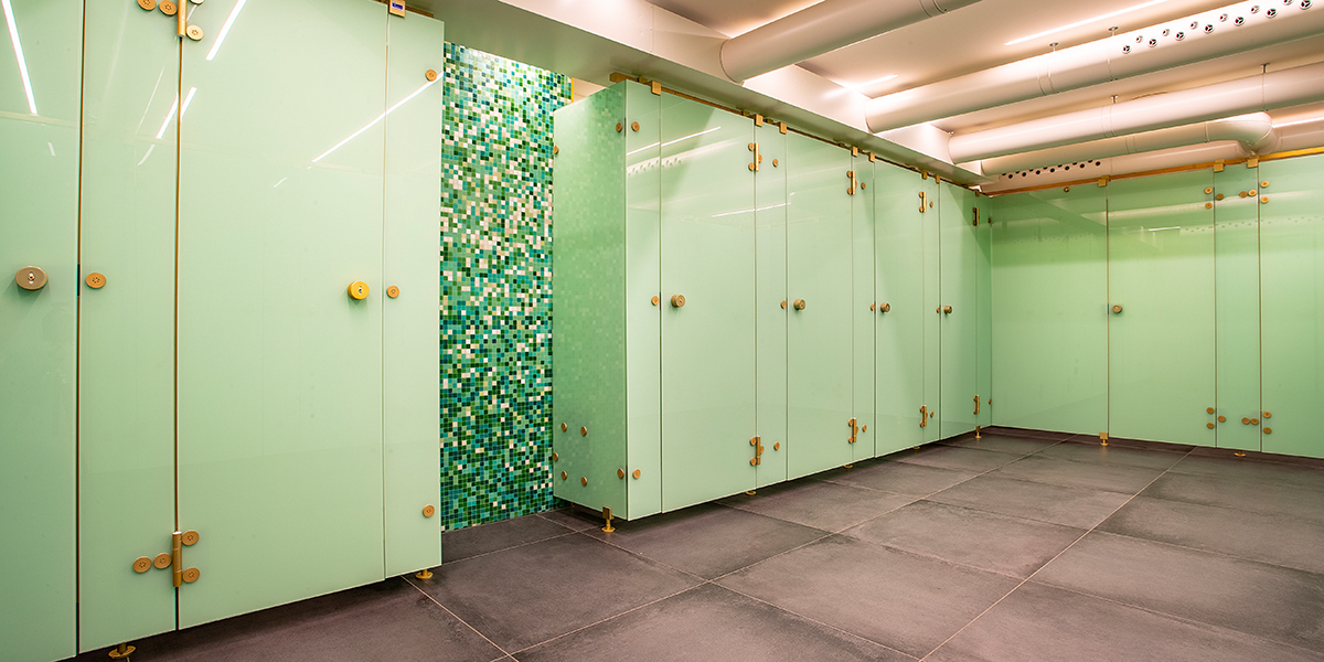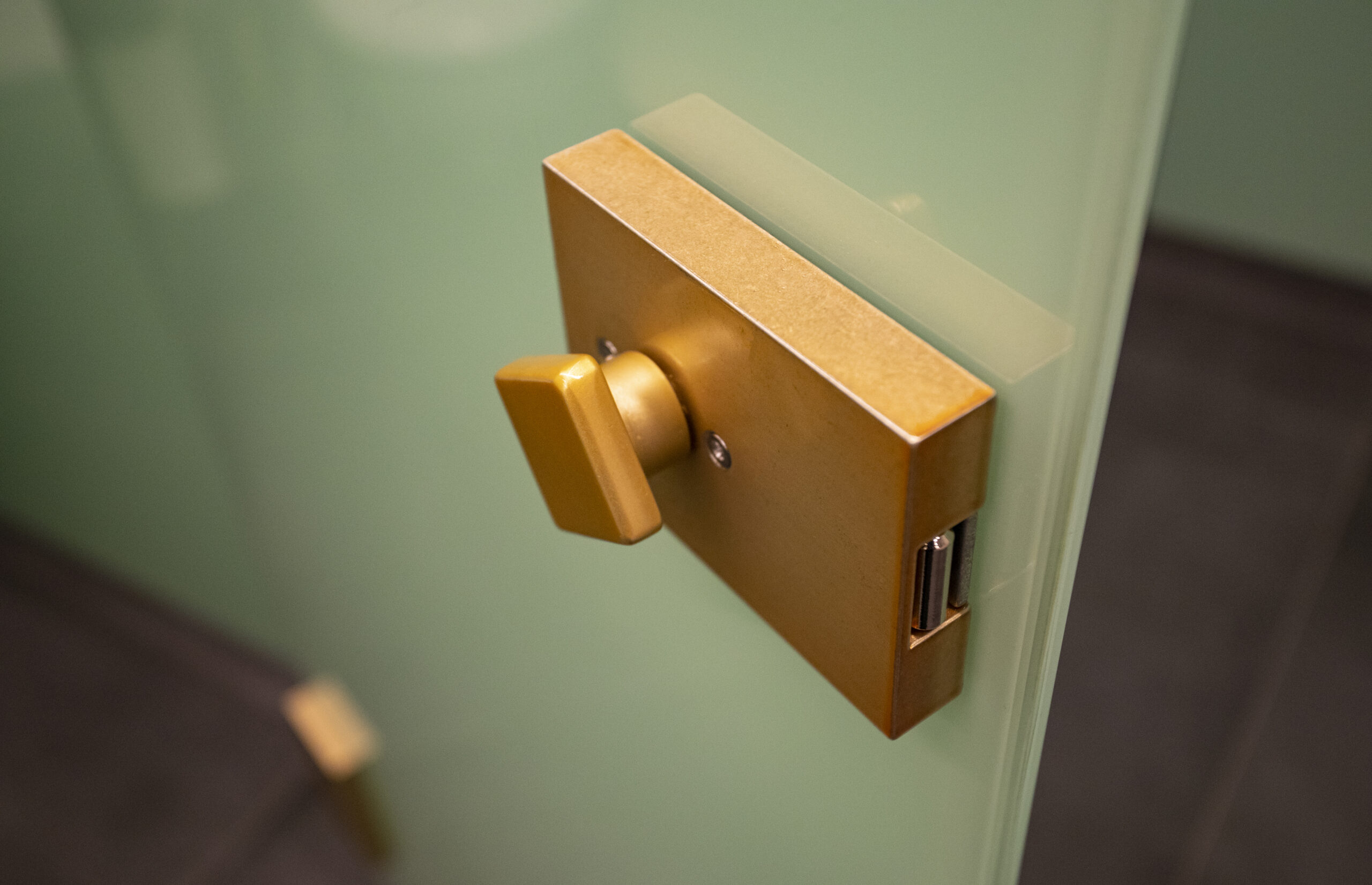 In der Jenaer Einrichtung „Volkshaus“ setzte KEMMLIT das WC-Trennwandsystem NOXX smart ein. Die Trennwände bestehen aus 10 mm starkem Verbundsicherheitsglas (VSG) in der Farbe Weißgrün 6504, was den Sanitärbereich hell und modern gestaltet. Bänder, Garnituren, Profile und Füße wurden in einer exklusiven goldfarbenen Eloxierung (EV03) ausgeführt und unterstreichen das hochwertige Erscheinungsbild.