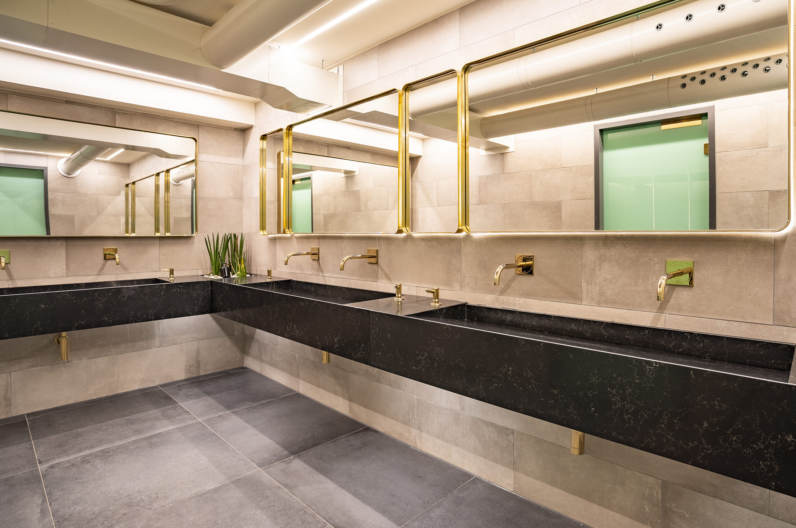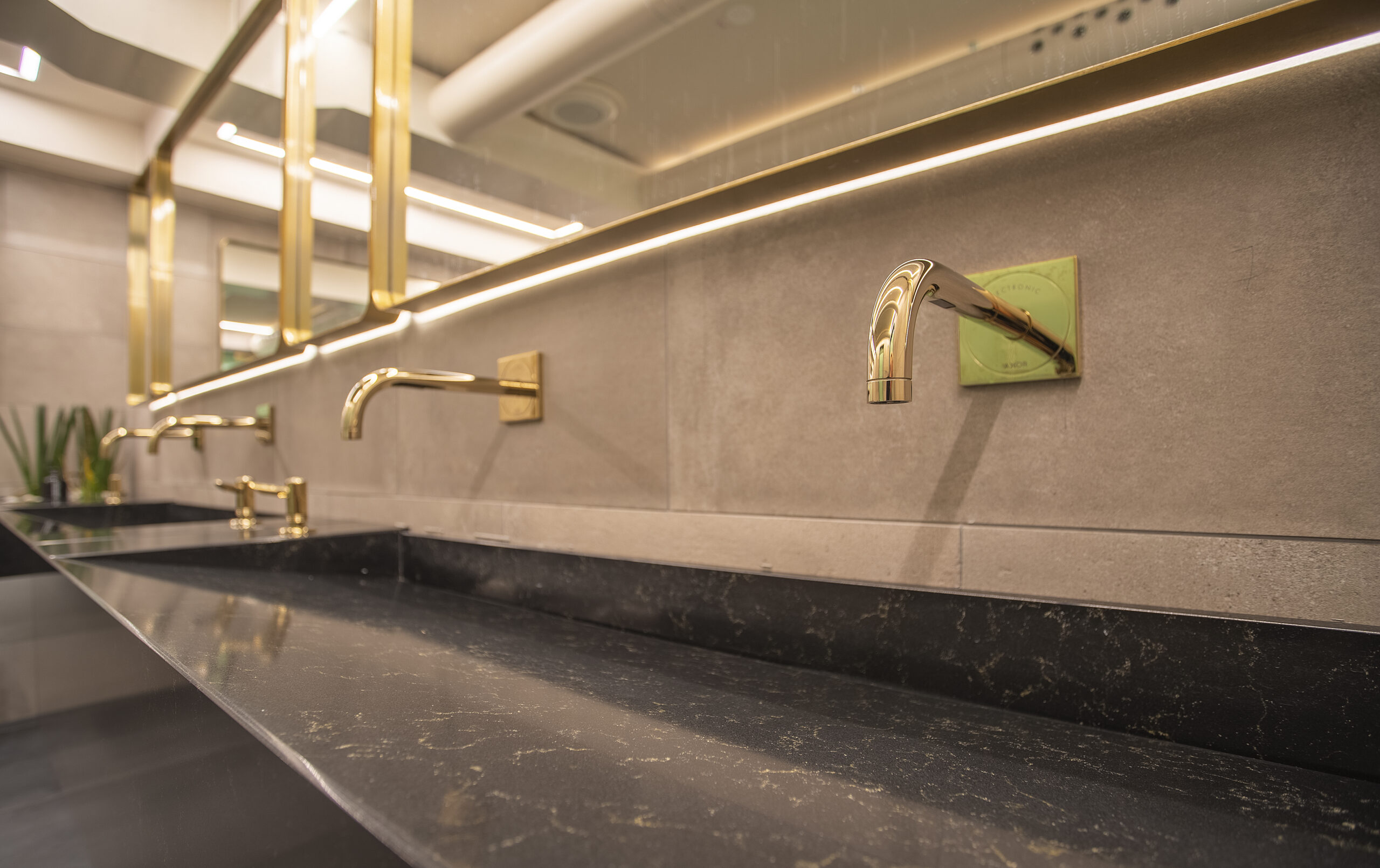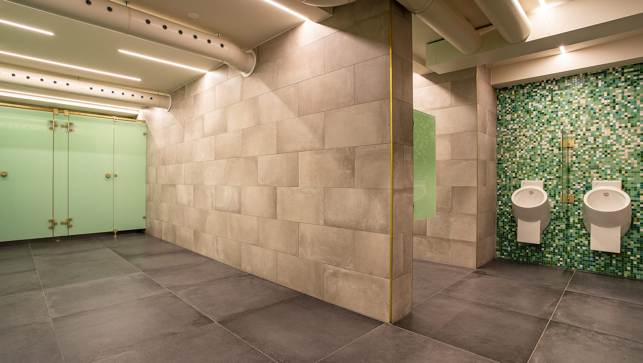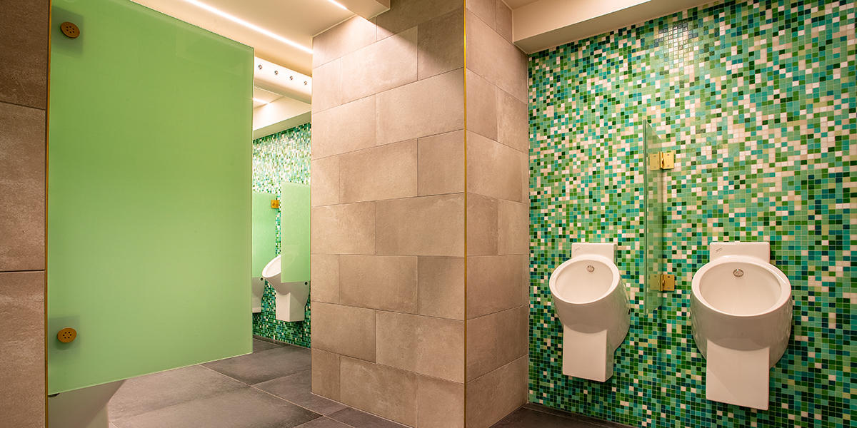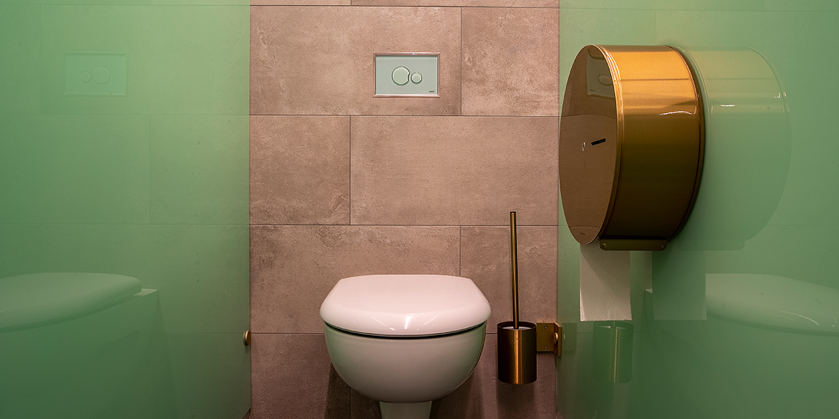 In der Jenaer Einrichtung „Volkshaus“ setzte KEMMLIT das WC-Trennwandsystem NOXX smart ein. Die Trennwände bestehen aus 10 mm starkem Verbundsicherheitsglas (VSG) in der Farbe Weißgrün 6504, was den Sanitärbereich hell und modern gestaltet. Bänder, Garnituren, Profile und Füße wurden in einer exklusiven goldfarbenen Eloxierung (EV03) ausgeführt und unterstreichen das hochwertige Erscheinungsbild.