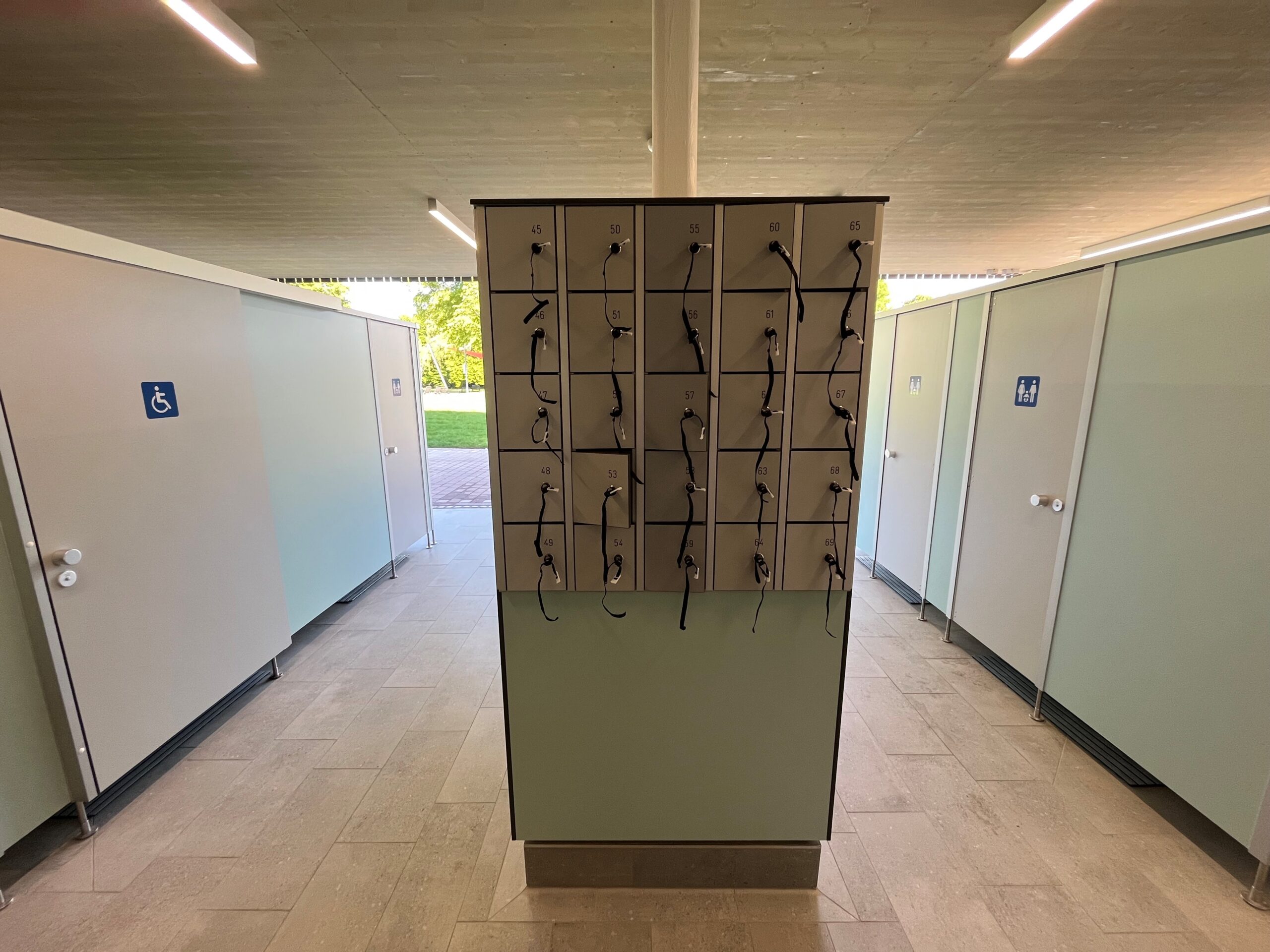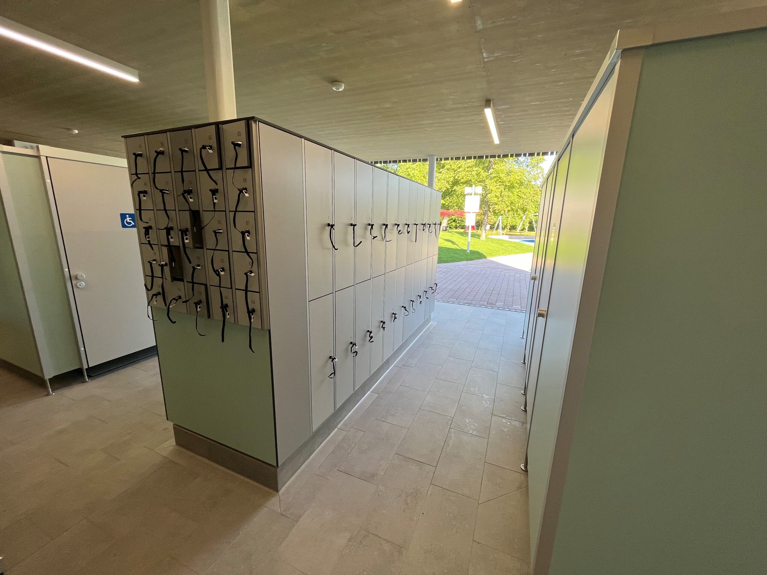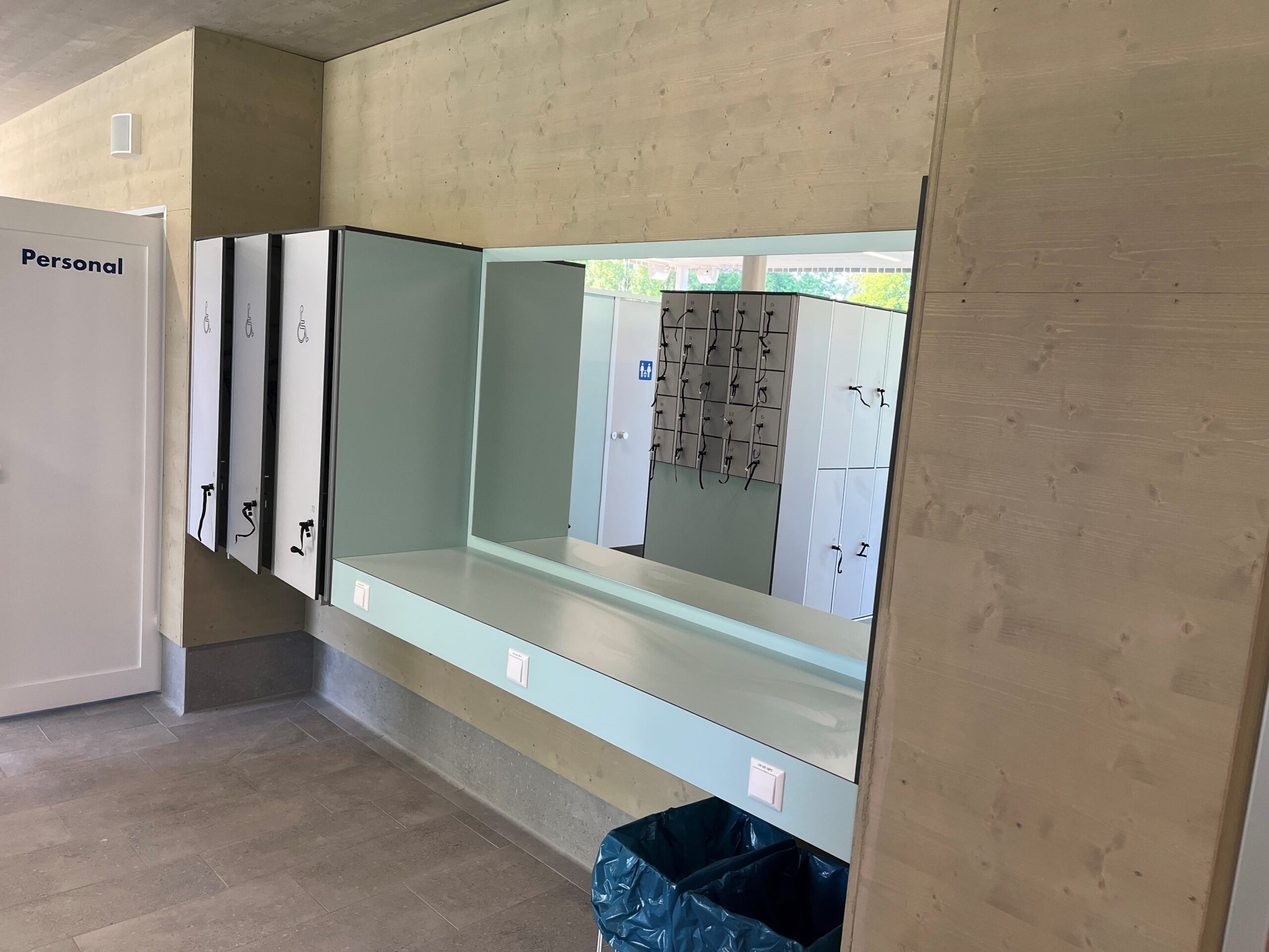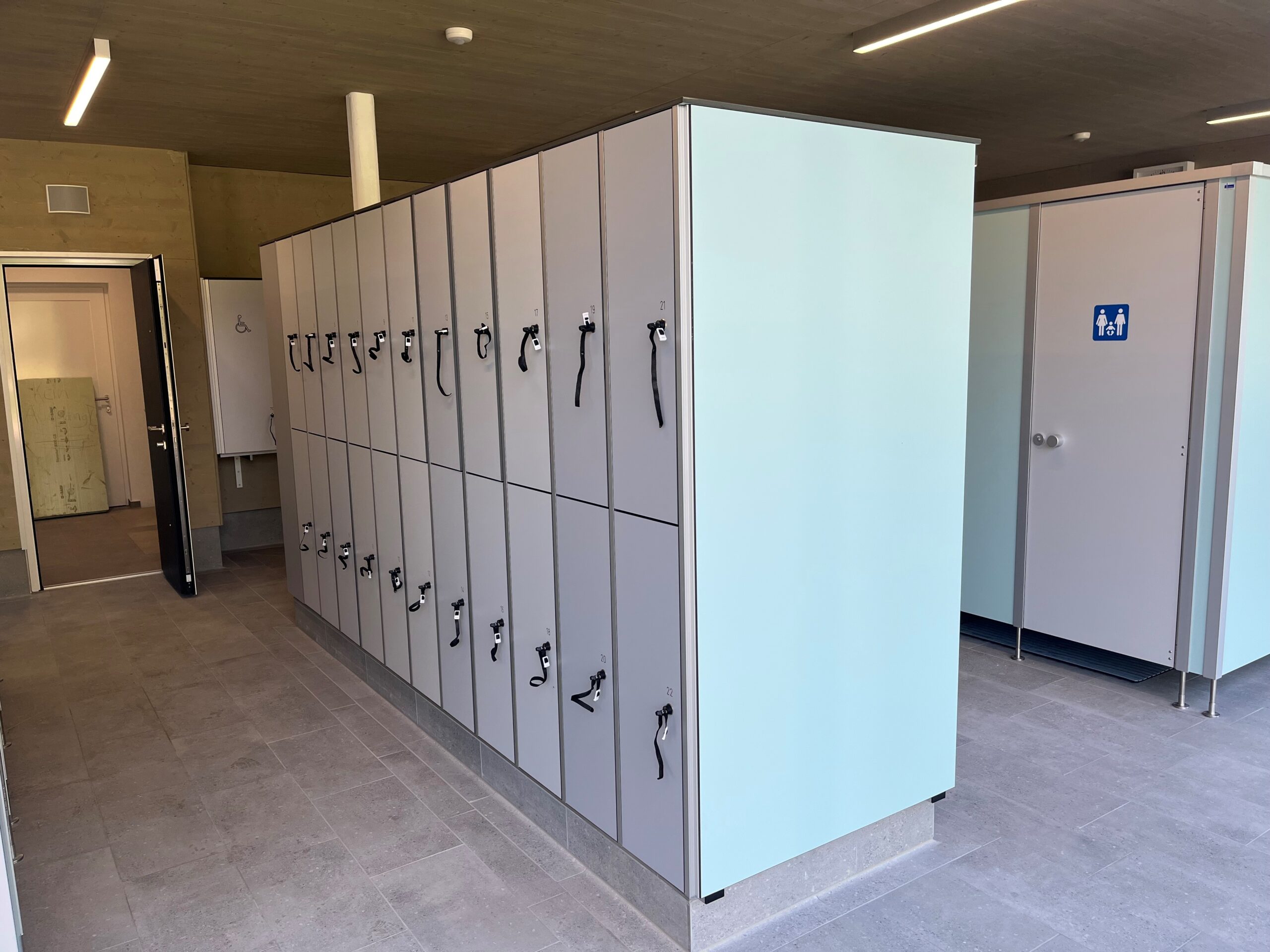 Die Umkleidebereiche wurden mit IXOS P Schränken ausgestattet. Die Schränke bestehen aus HPL-Vollkernplatten in stabiler Steckbauweise, sind wasserbeständig, pflegeleicht und bieten geordnete Aufbewahrungsmöglichkeiten. Zusätzlich wurden Wickelplätze, Waschtische, Fönplätze, Pendeltüren und Ablagen installiert, um die Sanitär- und Umkleidebereiche komplett auszustatten und eine komfortable Nutzung für Besucher zu gewährleisten.