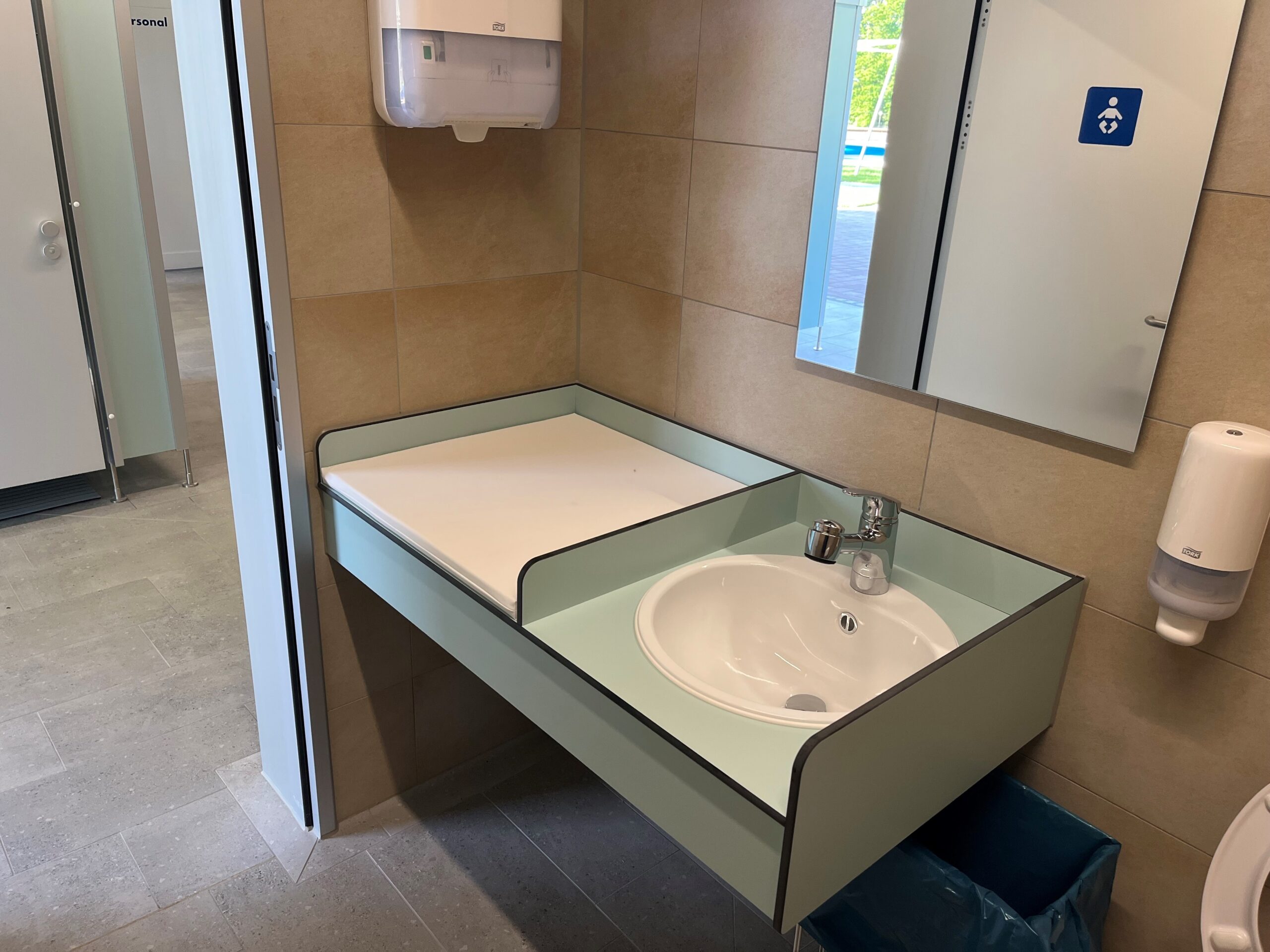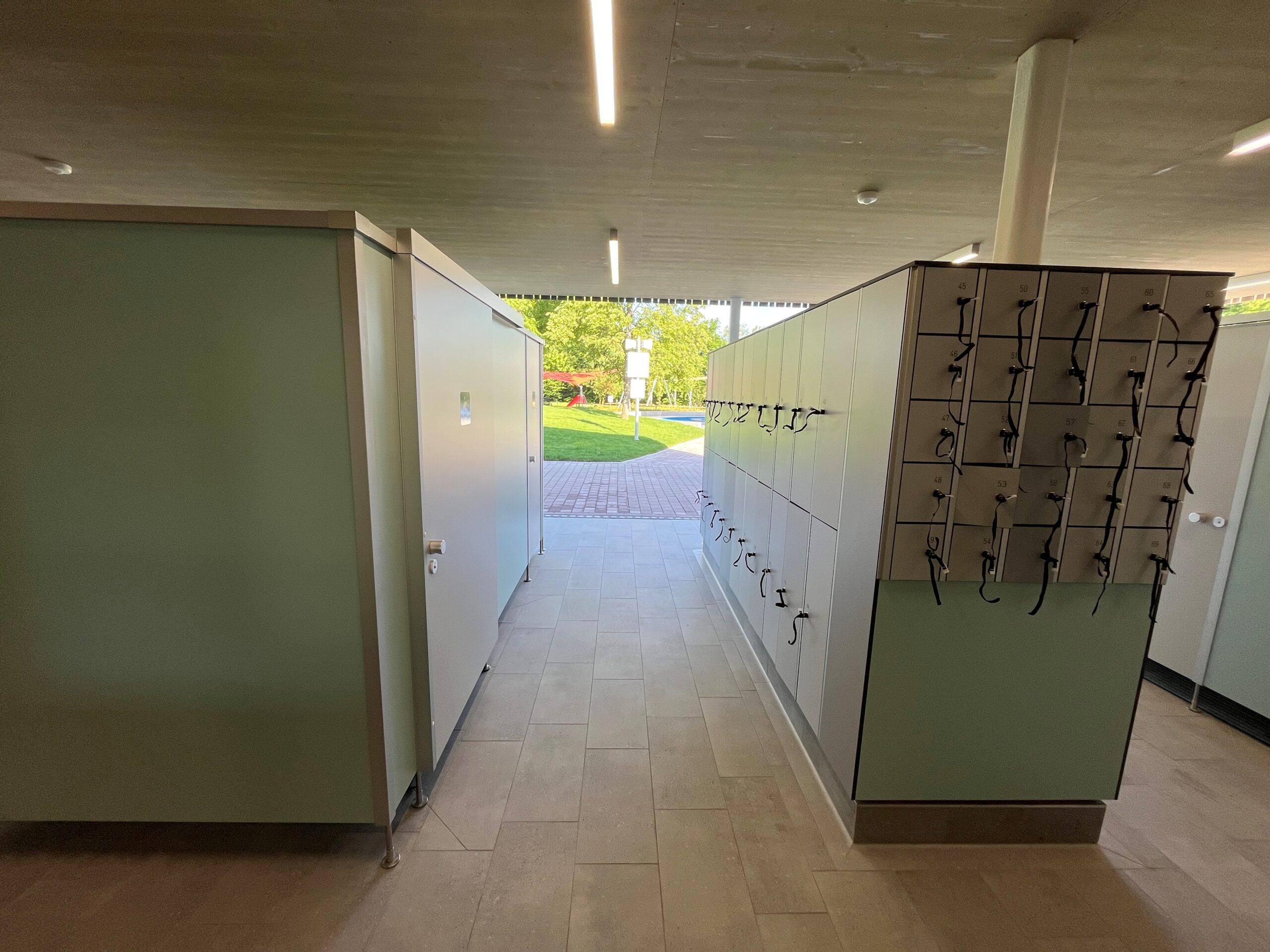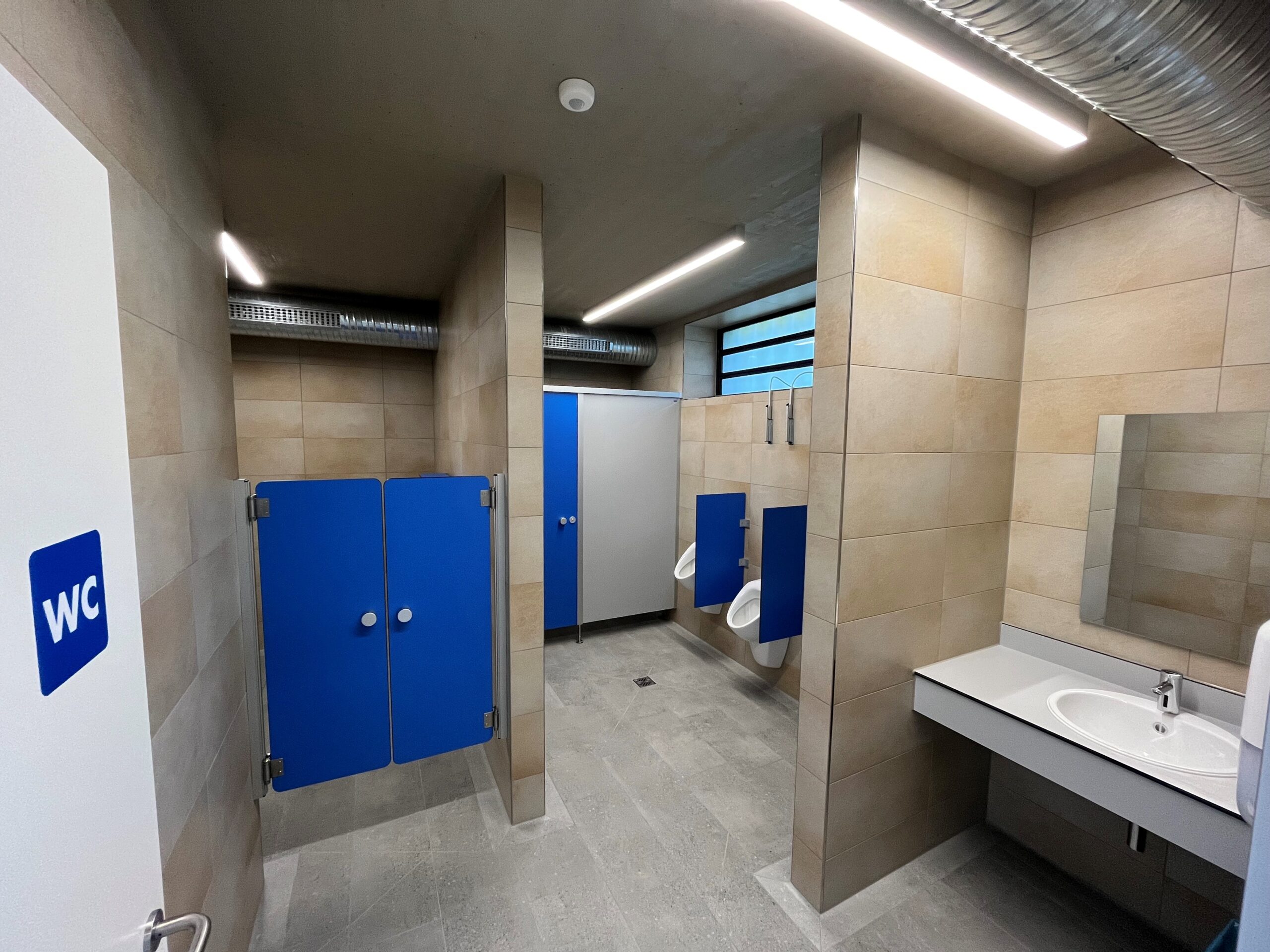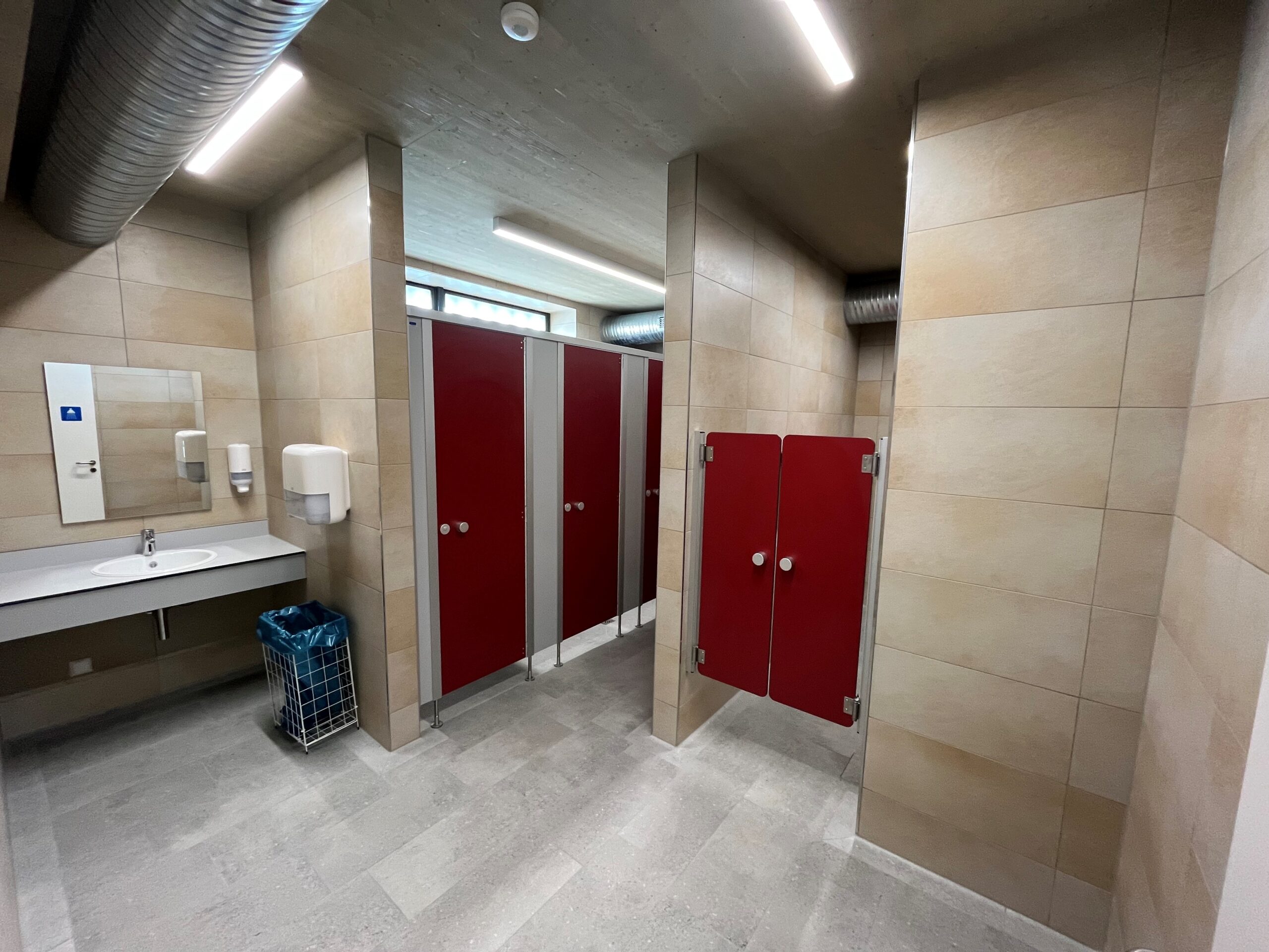 Die Umkleidebereiche wurden mit IXOS P Schränken ausgestattet. Die Schränke bestehen aus HPL-Vollkernplatten in stabiler Steckbauweise, sind wasserbeständig, pflegeleicht und bieten geordnete Aufbewahrungsmöglichkeiten. Zusätzlich wurden Wickelplätze, Waschtische, Fönplätze, Pendeltüren und Ablagen installiert, um die Sanitär- und Umkleidebereiche komplett auszustatten und eine komfortable Nutzung für Besucher zu gewährleisten.