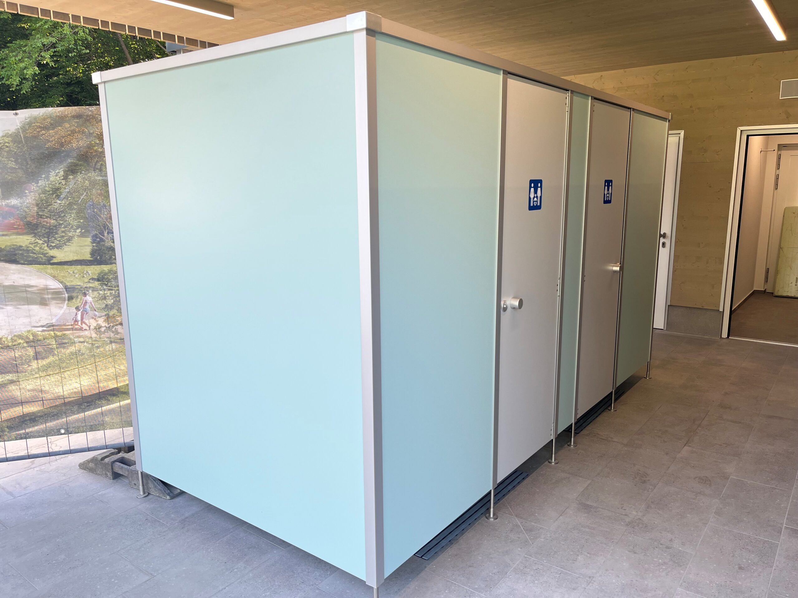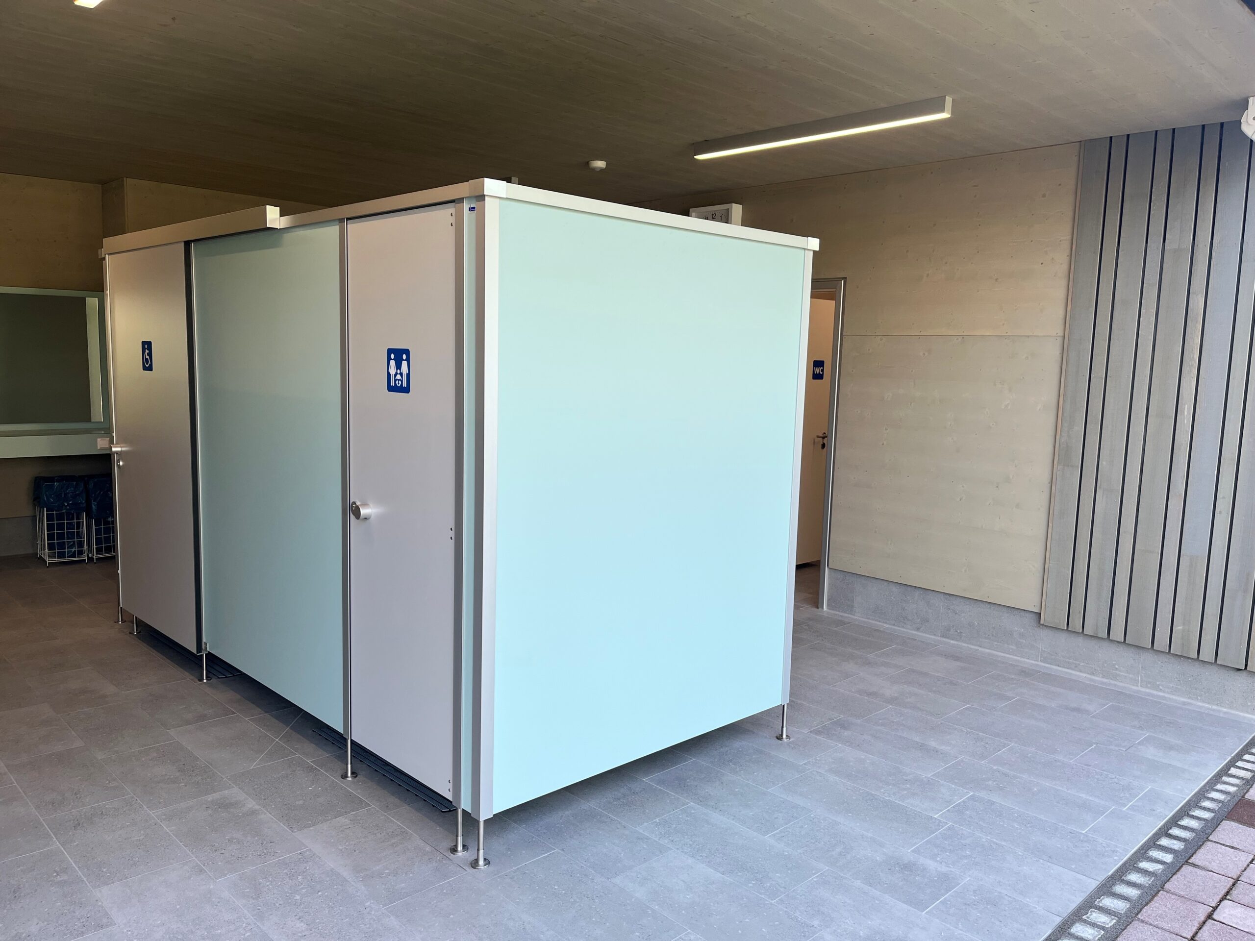 Im Wellenfreibad Reutlingen wurde der Neubau des Wasserspielplatzes mit WC-Trennwänden, Schränken und weiteren Ausstattungselementen von Kemmlit ausgestattet, um die Sanitär- und Umkleidebereiche funktional, langlebig und benutzerfreundlich zu gestalten. Die WC-Trennwände Cronus bestehen aus 13 mm starken, wasserresistenten HPL-Vollkernplatten und sind für Nass- und Feuchträume geeignet. Das System kann flexibel an die räumlichen Gegebenheiten angepasst werden und dient sowohl als WC-Kabine als auch als Wechselkabine. Die Trennwände wurden in Sonderfarben ausgeführt; Seegrün, Aschgrau, Kühlgrau, Pastellgrau sowie Pazifikblau, Granatrot und Hellgrau.