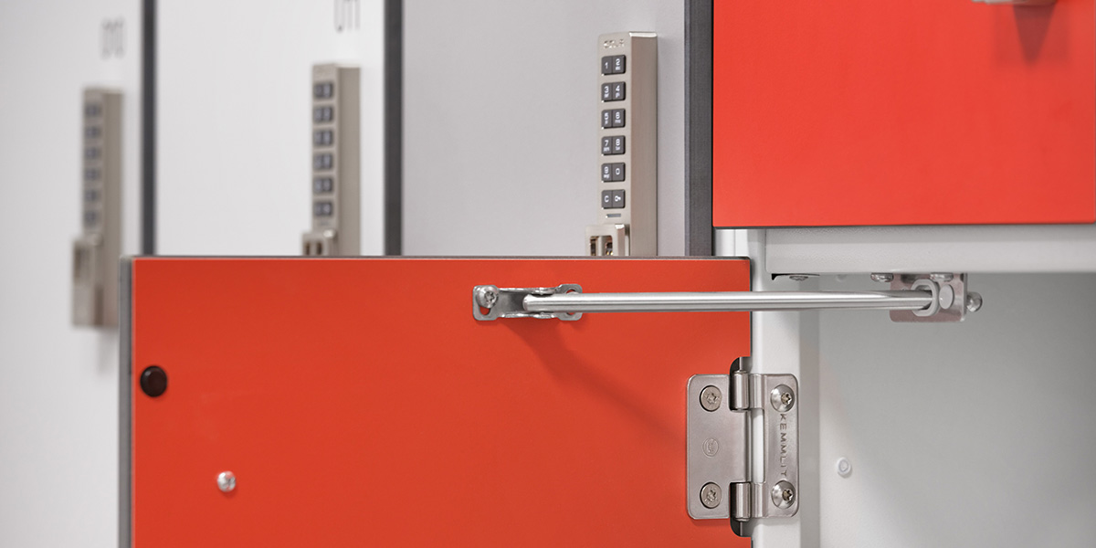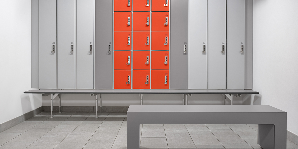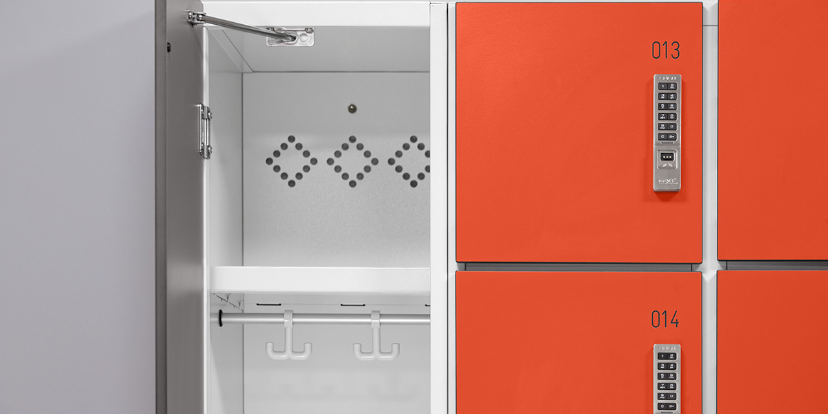 - Garderobenspinde und Wertfächer TYPO S, Schranktüren aus HPL mit elektronischen PIN Schloss.