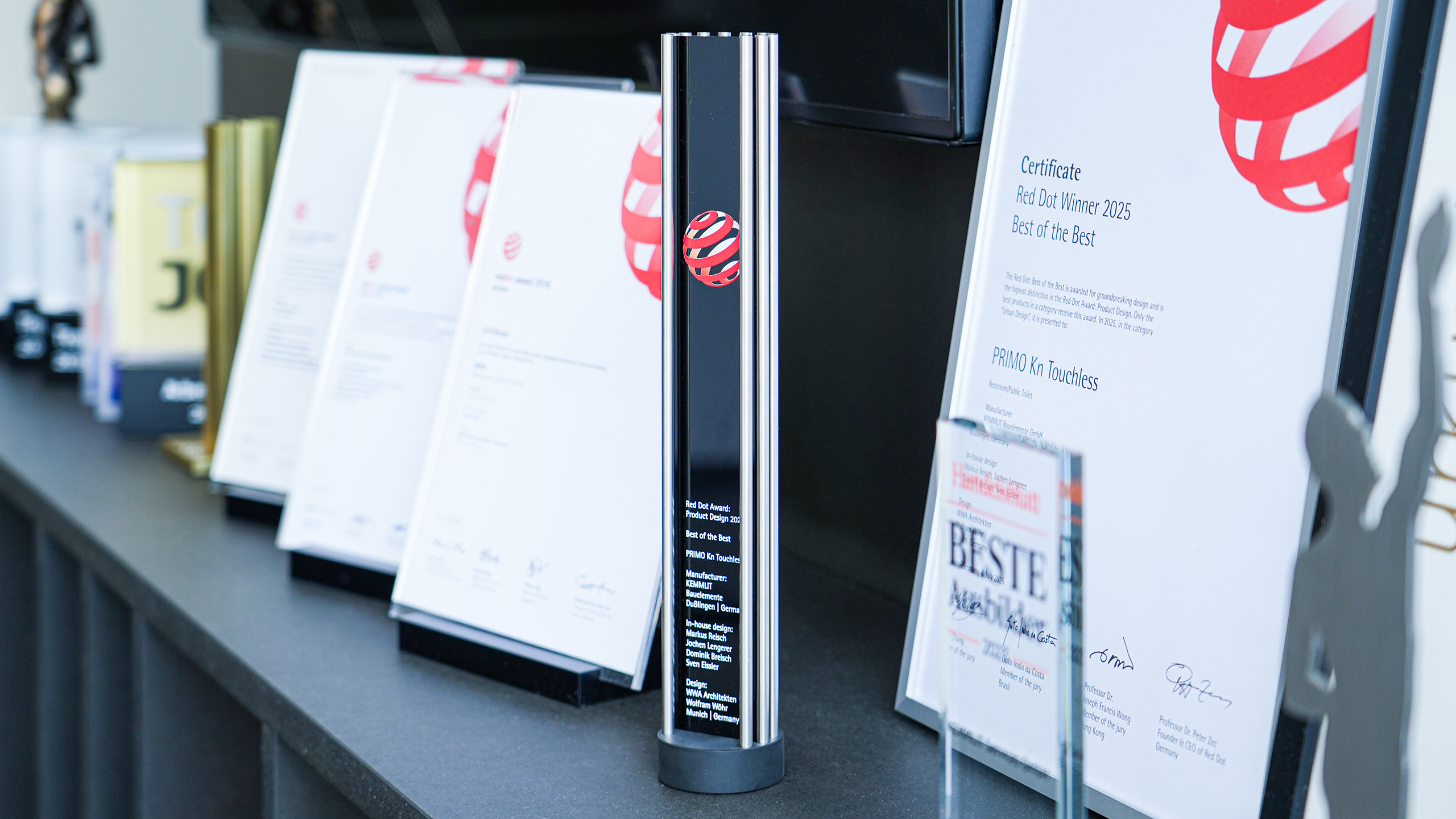 KEMMLIT verbindet prämiertes Design mit kompromissloser Fertigungsqualität. Unsere Systeme sind alle „Made in Germany“: langlebig, hygienisch und technisch präzise konstruiert. Ein Qualitätsniveau, das seit Jahren durch Awards und Zertifizierungen bestätigt wird.
