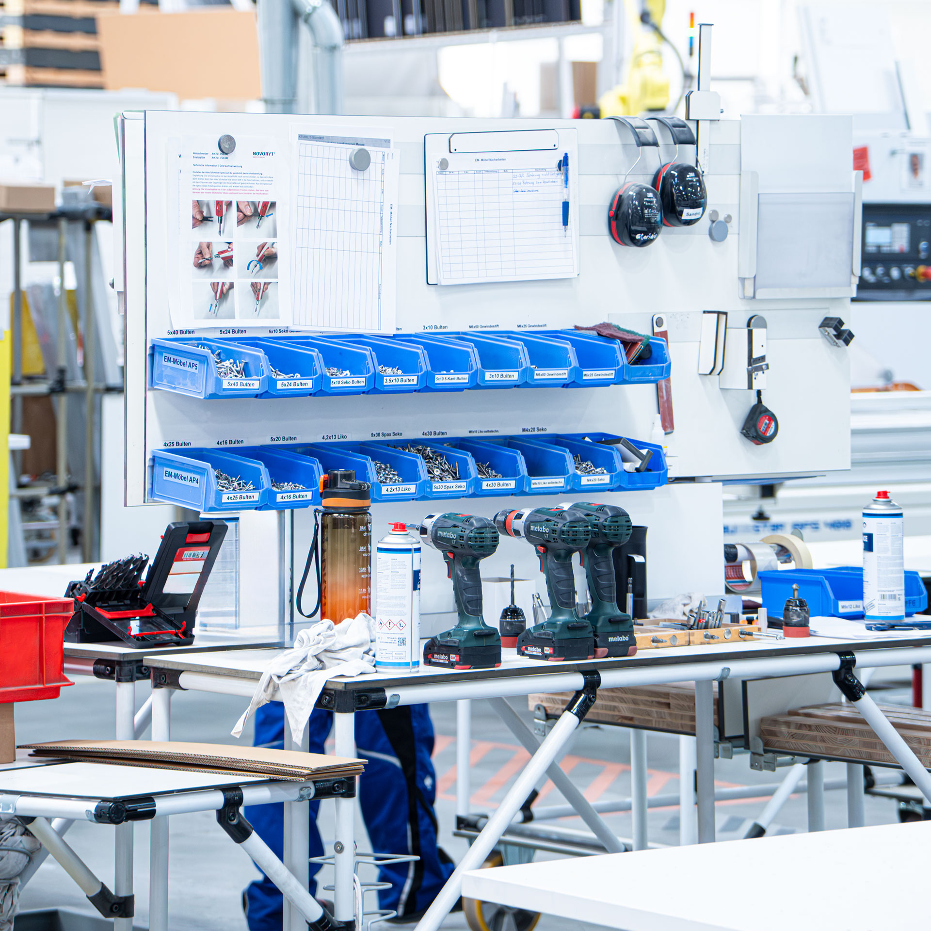 Damit wir unsere Ziele erreichen, schaffen wir für unsere Mitarbeiter optimale Arbeitsbedingungen – jederzeit und ohne Hindernisse. Dafür haben wir ein eigenes System zur Arbeitsvorbereitung entwickelt. Arbeitsplätze werden kontinuierlich optimiert, Werkzeuge und Materialien sind stets verfügbar und einsatzbereit.
